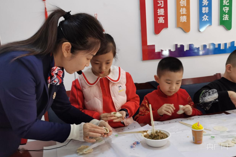 孩子們聽老師講傳統(tǒng)習(xí)俗體驗包餃子(央廣網(wǎng)發(fā) 唐欣 攝)