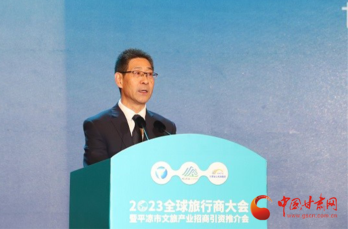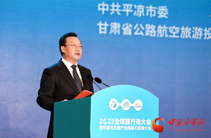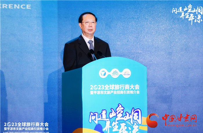 何效祖在致辭中說,平?jīng)鍪歉拭C向東開放的“門戶”城市,是風(fēng)景宜人的旅游城市,是甘肅布局的文旅康養(yǎng)基地和支撐“一核三帶”區(qū)域發(fā)展格局中的重要支點(diǎn),擁有崆峒山、大云寺·王母宮、瑤池溫泉等眾多聞名遐邇的人文和自然景觀。今天,我們與平?jīng)鍪形姓?、中國旅行社協(xié)會、甘肅公航旅集團(tuán)一道搭建平臺,誠邀各位嘉賓走進(jìn)甘肅、深入平?jīng)觯M織開展宣傳推介、洽談合作、展示展銷、考察踩線等系列活動,就是要引導(dǎo)大家深度感知甘肅高質(zhì)量發(fā)展的強(qiáng)烈愿望,實(shí)地觸摸甘肅文旅如火如荼的生動實(shí)踐,誠懇表達(dá)隴原兒女“視企業(yè)家為最寶貴財富”的真誠合作和赤誠服務(wù)之心。我們衷心希望,廣大中外旅行商和文旅專家、文旅企業(yè)家以本次大會為契機(jī),加強(qiáng)交流互鑒,深化務(wù)實(shí)合作,加大在甘投資力度,組織更多游客到甘肅觀光旅游,帶動更多優(yōu)質(zhì)文旅企業(yè)和項(xiàng)目落戶甘肅,合力譜寫甘肅文旅高質(zhì)量發(fā)展的嶄新篇章!
