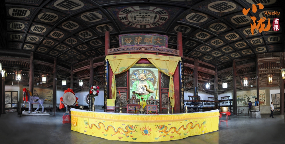 先天殿莊嚴肅穆,殿內(nèi)正中便是高達3米的人文始祖伏羲坐身塑像,樹葉披身,手持八卦盤,氣宇軒昂,雙目炯炯凝視前方,神龕上方懸掛著清嘉慶時州牧王賜均書“文明肇啟”巨匾,仰頭上望,頂上繪有河圖洛書、六十四卦,令人肅然起敬。