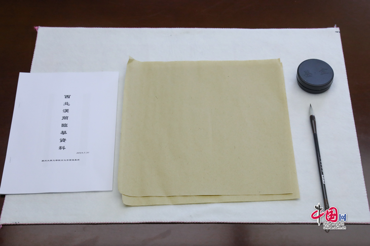 蘭州大學(xué)古文字學(xué)強(qiáng)基計劃同學(xué)臨摹簡牘所用的資料與文具(拍攝于7月31日)。中國網(wǎng)記者 鄭偉 攝