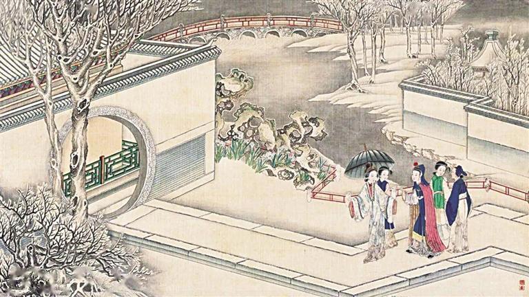 著名紅學(xué)家周汝昌曾評(píng)論清代孫溫《紅樓夢(mèng)》繪本是“紅樓瑰寶”,其中一處細(xì)節(jié)就配得上這種評(píng)論。賈政攜寶玉和眾客游覽大觀園的繪制中,孫溫用了13幅畫(huà)并以焦點(diǎn)游移的手法,一路將賈政等人的路線詳細(xì)描繪出來(lái),跟著畫(huà)面而走,觀者可以看到瀟湘館、蘅蕪院、沁芳亭、沁芳橋等大觀園景觀,令人嘆為觀止。
