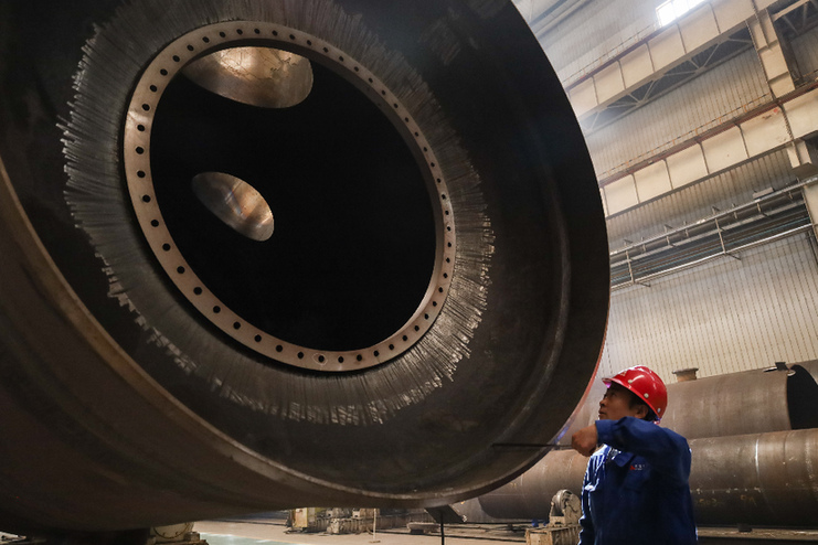 工人在蘭州新區(qū)蘭石集團(tuán)高端裝備產(chǎn)業(yè)園的生產(chǎn)車間作業(yè)。新華社記者 馬希平 攝