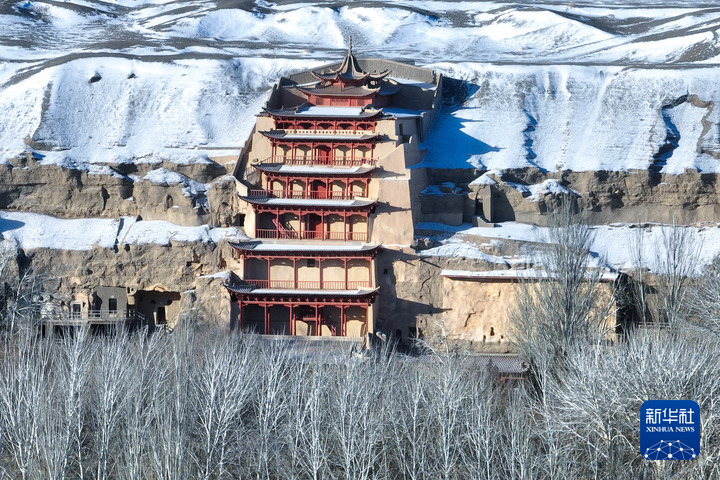 12月15日,甘肅省敦煌市迎來降雪天氣。雪后的世界文化遺產(chǎn)敦煌莫高窟銀裝素裹,景色如畫。新華每日電訊記者 郎兵兵 攝