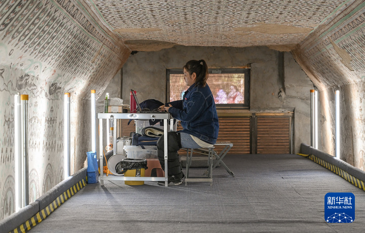 8月3日,在敦煌莫高窟正在保護(hù)修繕的第55窟內(nèi),一位文保工作者對采集的數(shù)據(jù)進(jìn)行整理。新華每日電訊記者 李賀 攝