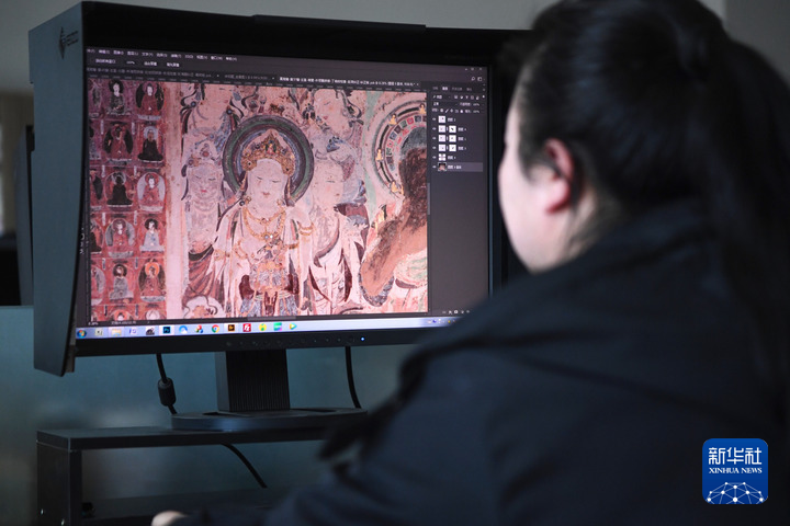 4月25日,敦煌研究院文物數(shù)字化保護(hù)團(tuán)隊(duì)圖像處理人員年海麗在拼接壁畫圖像。新華每日電訊記者 陳斌 攝
