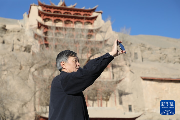 2022年2月23日 敦煌研究院院長蘇伯民正在用手機(jī)進(jìn)行“數(shù)字敦煌”體驗(yàn)。新華每日電訊記者 張睿 攝