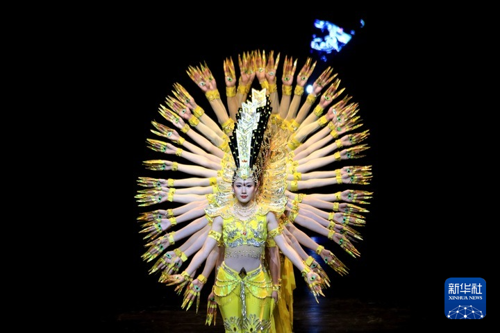 9月10日晚,在甘肅敦煌大劇院,演員在大型情景音畫劇《千手千眼》中表演。新華社發(fā)(張曉亮 攝)