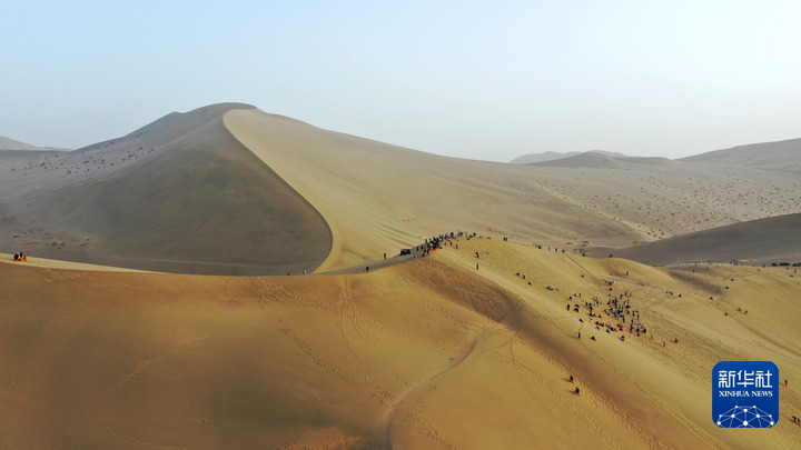 9月11日,游客在甘肅省敦煌市鳴沙山月牙泉景區(qū)游覽。新華社發(fā)(張曉亮 攝)