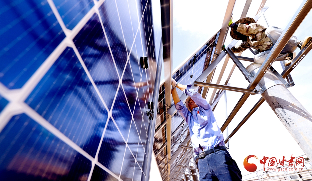 4月15日,甘肅省張掖市臨澤縣板橋鎮(zhèn)一養(yǎng)殖場工地上,工程建設(shè)者們正在安裝光伏板。