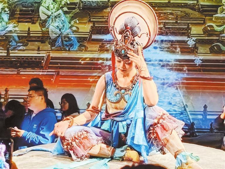 “真是一場(chǎng)酣暢淋漓的敦煌樂(lè)舞盛宴。雖然這趟旅程我們還沒(méi)有去敦煌莫高窟,但看罷這場(chǎng)演出,已經(jīng)對(duì)莫高窟壁畫有了初步的認(rèn)知。莫高窟壁畫的精華部分,借助高科技手段和演員的精彩演繹,在我們眼前立體延展開來(lái),同時(shí)劇場(chǎng)內(nèi)大量復(fù)刻了佛龕、蓮花臺(tái)、藻井等特色形制,讓我們‘一眼入境’,帶我們走進(jìn)歷史深處,觸摸文明脈動(dòng)。”浙江游客王松攜家人觀看《樂(lè)動(dòng)敦煌》后,發(fā)出贊嘆。