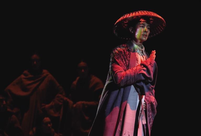 在音樂劇《飛天》的舞臺上,敦煌元素豐富,各色形象躍然而出。無論是對《鹿王本生》《千釘求法》《入海求珠》《舍身飼虎》四則經(jīng)典故事的再現(xiàn),還是九色鹿、烏鴉、勞度叉、枇楞揭梨、公主、善友等各色形象的還原,抑或?qū)Φ?57窟、第275窟、第296窟、第428洞窟等石窟壁畫的描摹再現(xiàn),古今歷史的交疊盡現(xiàn)眼前……敦煌壁畫中那些靜默千年的人物,宛如靈魂覺醒般緩緩浮現(xiàn),穿越了千年的歲月長河,與觀眾進(jìn)行了一場跨越時空的深情對話。