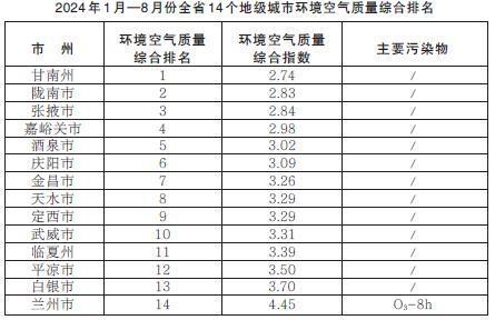 甘肅省生態(tài)環(huán)境廳發(fā)布2024年1月—8月份全省14個地級城市環(huán)境空氣質(zhì)量排名情況