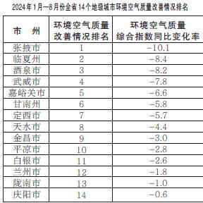2024年1月—8月份,全省14個地級城市環(huán)境空氣質(zhì)量改善情況排名由好到差分別為:張掖市、臨夏州、酒泉市、武威市、嘉峪關市、甘南州、定西市、天水市、金昌市、平?jīng)鍪?、白銀市、蘭州市、隴南市、慶陽市。