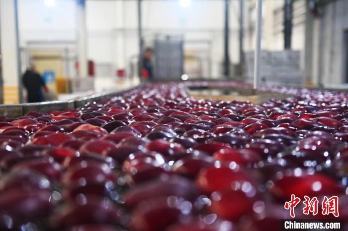 10月21日,在甘肅省天水市秦安縣雪原果品有限公司加工車間,蘋果自動(dòng)化分揀線正在運(yùn)行。中新社記者李亞龍攝