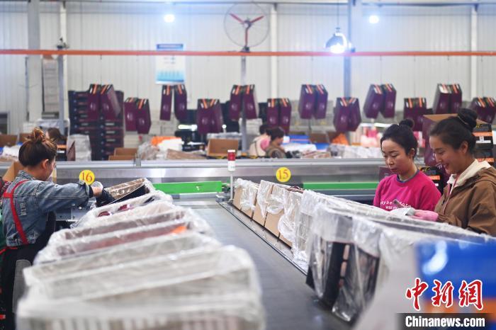 10月21日,在甘肅省天水市秦安縣雪原果品有限公司加工車間,蘋果自動(dòng)化分揀線上工作人員進(jìn)行分揀工作。中新社記者李亞龍攝