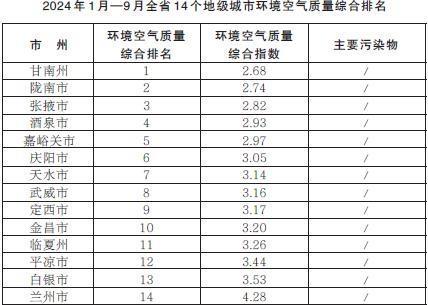 2024年1月—9月,全省14個(gè)地級城市環(huán)境空氣質(zhì)量綜合排名由高到低分別為:甘南州、隴南市、張掖市、酒泉市、嘉峪關(guān)市、慶陽市、天水市、武威市、定西市、金昌市、臨夏州、平?jīng)鍪?、白銀市、蘭州市。