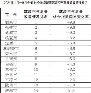 2024年1月—9月,全省14個(gè)地級城市環(huán)境空氣質(zhì)量改善情況排名由好到差分別為:酒泉市、張掖市、武威市、臨夏州、定西市、嘉峪關(guān)市、天水市、甘南州、白銀市、蘭州市、金昌市、平?jīng)鍪?、隴南市、慶陽市。