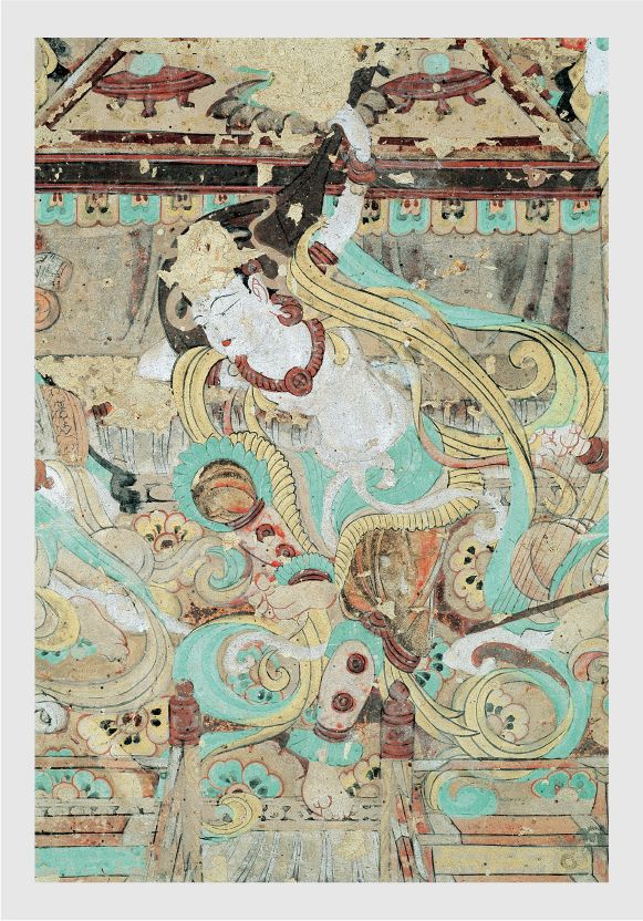 為了生動地表現(xiàn)出舞樂的真實感,畫師巧妙地采用了透視的技法。通過這種透視技法,觀者仿佛置身于真實的演出現(xiàn)場,能夠真切地感受到伎樂天伴著仙樂翩翩起舞的美妙場景。她修長的飄帶也隨著舞姿而扭動起來,仿佛有了生命一般。一千年之后,畫面被定格在了那一刻,成為了永恒的經(jīng)典。