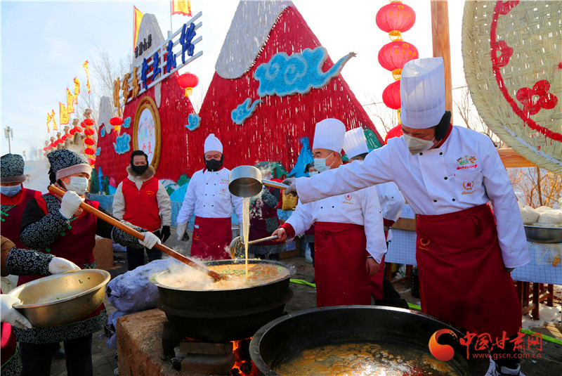 不必等炊煙裊裊的清晨,冬至日的祁店村從凌晨便沸騰起來。村頭的文化廣場上,八十口直徑逾一米的大鐵鍋一字排開,灶火熊熊燒得正旺,火苗舔舐著鍋底,將牛骨湯煮得咕嘟作響,濃郁的香氣裹著水汽,在半空中凝成一片白霧。案板前,數(shù)十位身著圍裙的“面嫂”巧手翻飛,揪面、摁花、搓形,一個個圓潤飽滿、帶著木梳紋路的“牛娃子”不斷滾落,轉(zhuǎn)眼便堆成了小山。來自天南海北的游客與本地村民摩肩接踵,有的挽起袖子加入制作的行列,有的踮著腳尖張望鍋里的動靜,還有的舉著手機直播這場盛事。當(dāng)?shù)谝诲伵M拮语堉蠛?,工作人員用大鐵勺盛起,分送到等候已久的人們手中,廣場上頓時響起此起彼伏的吸溜聲與贊嘆聲。八萬人圍鍋而坐,大碗盛飯、大口喝湯,凜冽的寒風(fēng)里,一碗熱飯下肚,渾身都暖透了,這便是山丹獨有的“萬人同吃牛娃子飯”的熱鬧圖景。