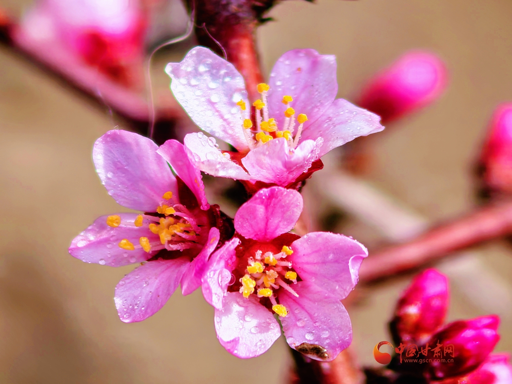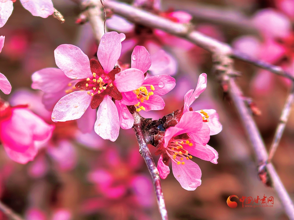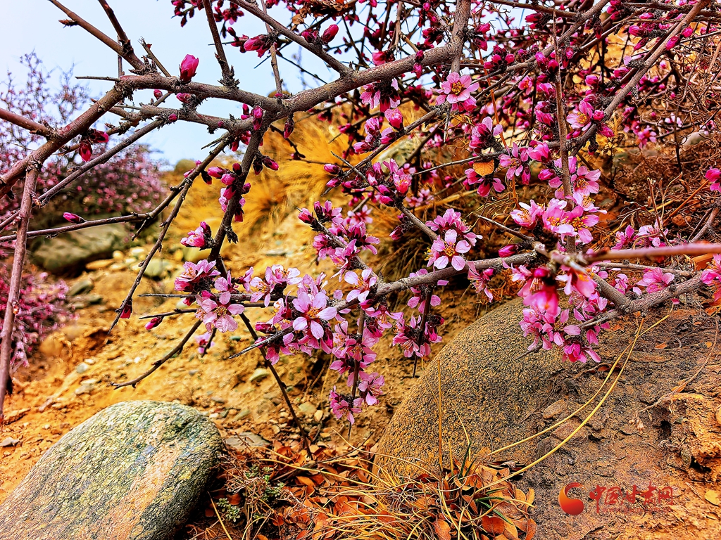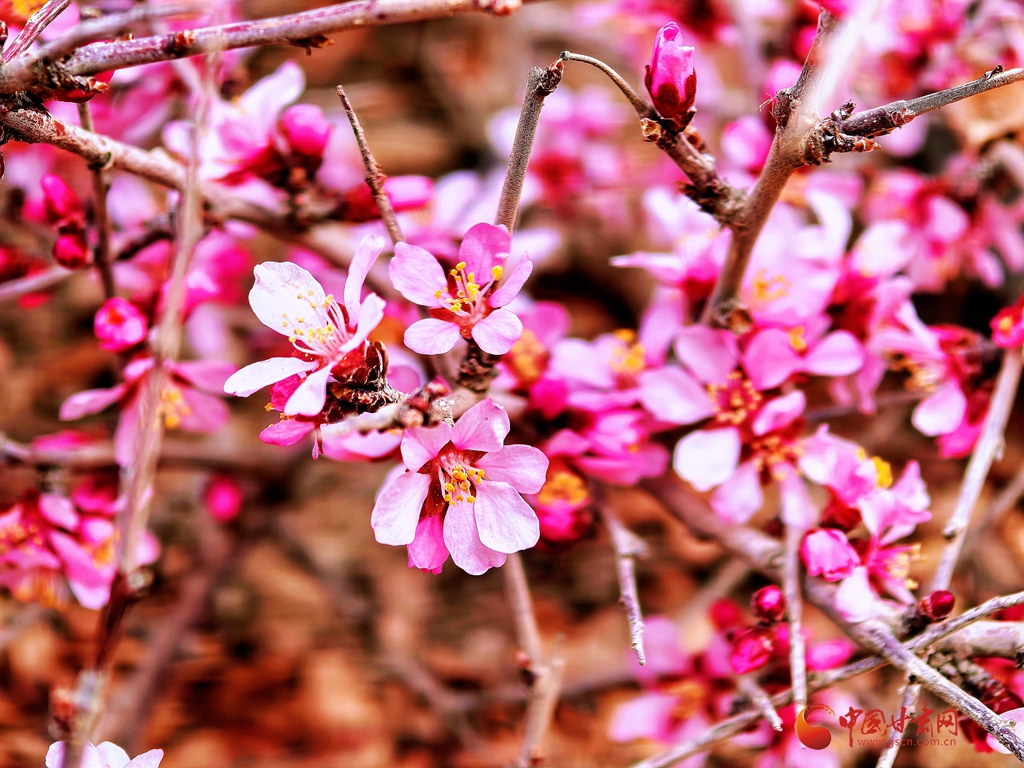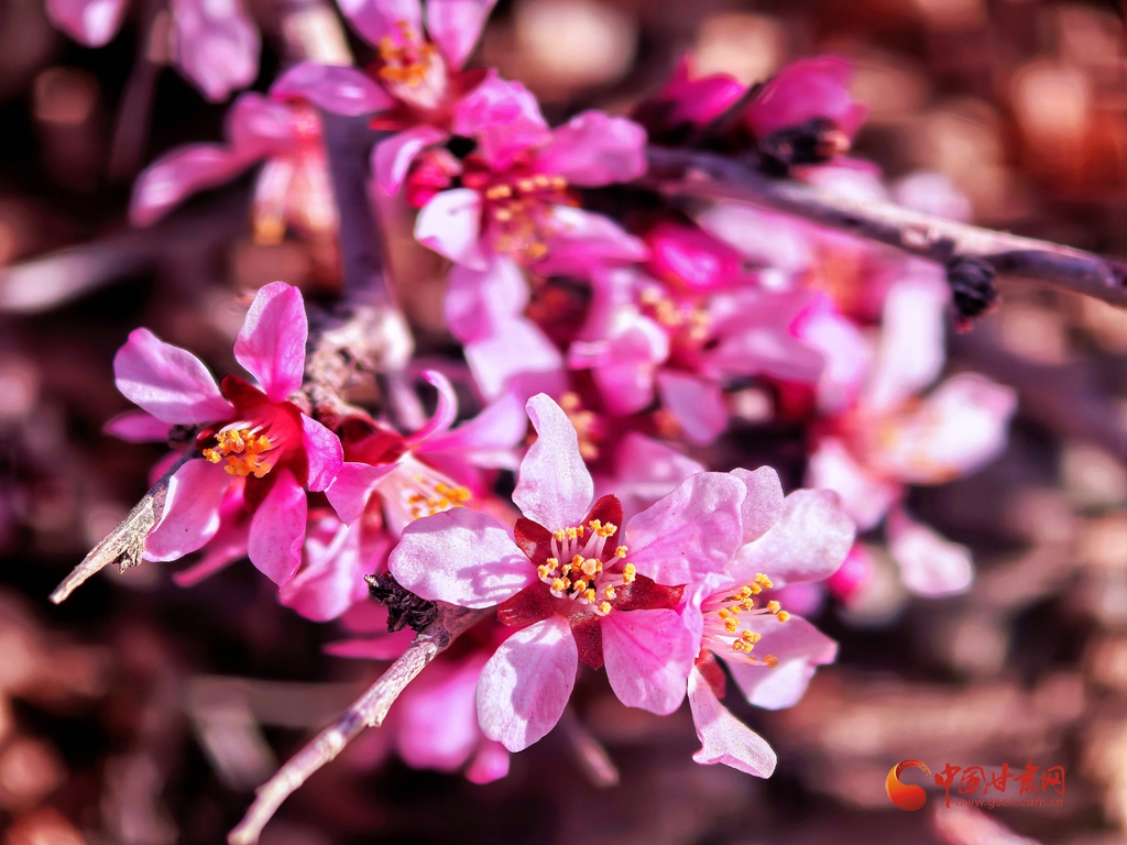 光禿禿的枝條上,不見半片新葉,只有一簇簇、一團(tuán)團(tuán)粉紅色的小花,密密匝匝地綴滿枝頭,擠擠挨挨,溫暖又熱烈。遠(yuǎn)遠(yuǎn)望去,像一縷輕盈的粉紅色云煙,輕輕飄落在蒼黃的山坡上,為沉寂的祁連山添上一抹難得的溫柔亮色;走近細(xì)看,花瓣薄如蟬翼,質(zhì)地輕盈細(xì)膩,嫩黃的花蕊纖細(xì)挺立,在寒風(fēng)中微微顫動,看似柔弱的外表下,藏著不屈的傲骨。偶爾一場春雪突襲,潔白的雪花壓彎枝頭,花朵看似垂落不堪,可待到雪化風(fēng)輕,它便立刻挺直腰肢,重新舒展花瓣。夜里寒霜凍得花瓣晶瑩透明,仿佛一碰就碎,可朝陽升起,寒冰慢慢消融,花朵依舊盛放如初,不曾輕易凋零半分。