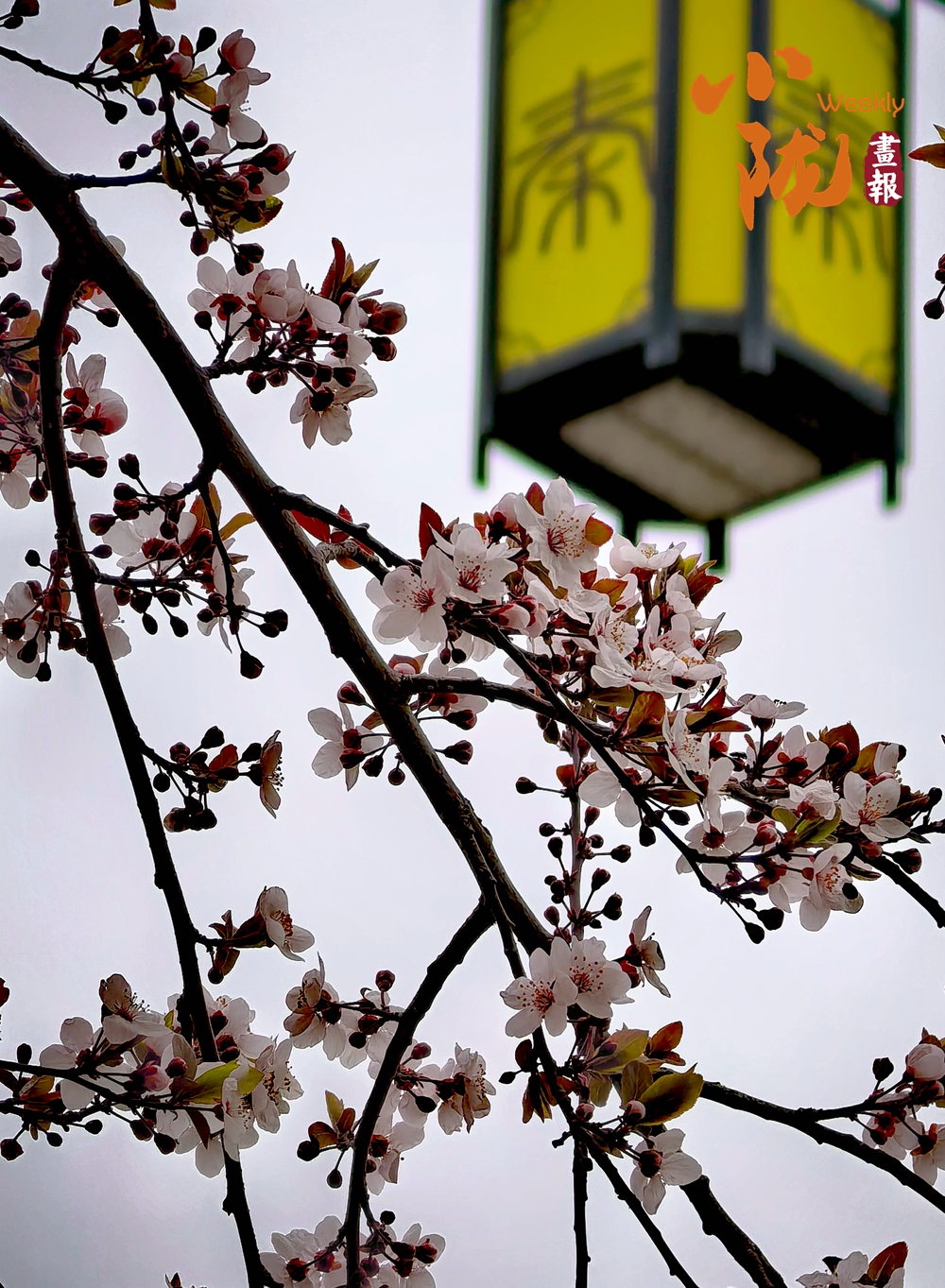 紫葉李花開滿枝,白中帶粉的花瓣簇?fù)碓谥︻^,搭配著深褐枝椏與古色古香的街燈,將春日的柔美與街巷的煙火氣悄然融合,盡顯別樣的春日情韻。