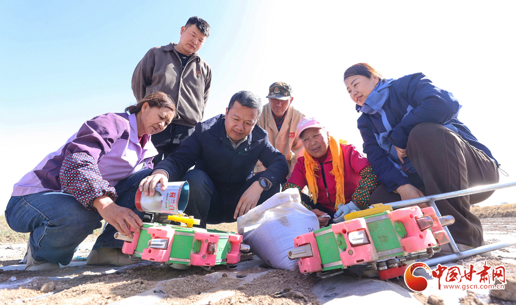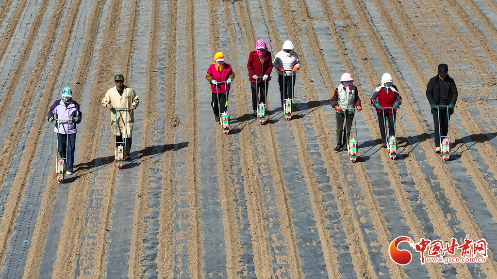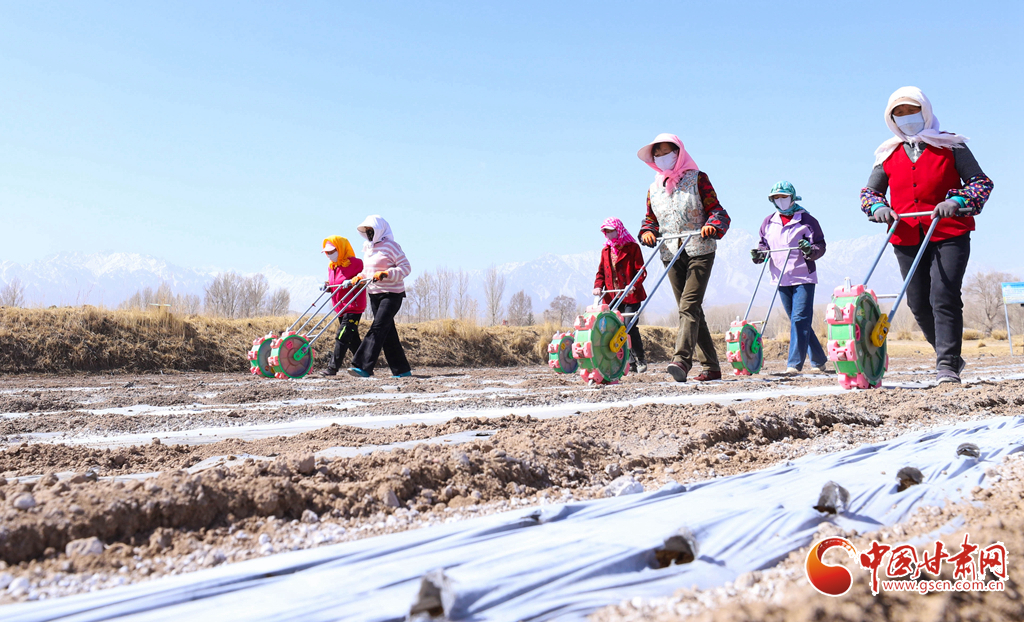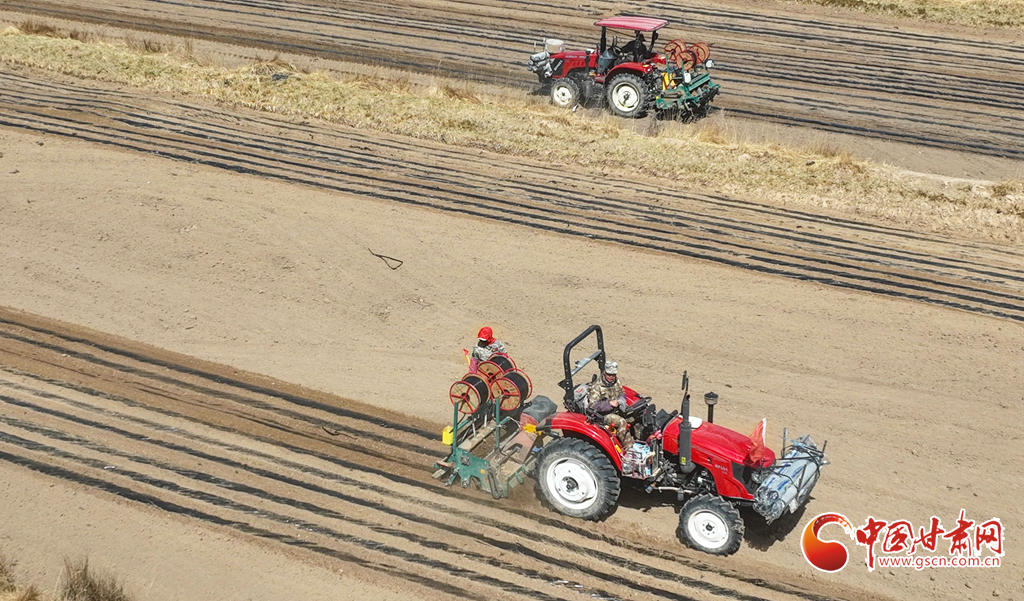 4月3日,張掖市民樂縣5萬多畝制種油菜基地上,種植戶正忙著覆膜、鋪設滴灌帶,并用手扶小型滾輪播種器進行精量播種,田間地頭一派繁忙的春耕景象。
