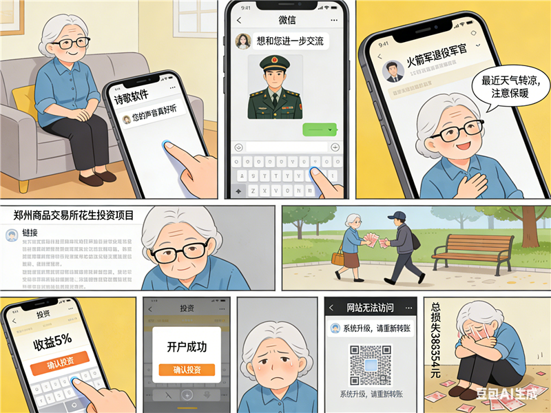 警方拆解該案騙術(shù)發(fā)現(xiàn),騙子共分七步將紀奶奶從“詩友”變成“提款機”。第一步,潛入詩歌朗誦這類中老年人聚集的興趣社群,精準篩選目標;第二步,以“聲音好聽”為切入點,通過情感鋪墊營造“黃昏戀”錯覺,建立情感依賴;第三步,多次切換聊天軟件,躲避平臺反詐監(jiān)測;第四步,偽裝“火箭軍”身份,利用老一輩對軍人的天然信任感,以國家信譽背書;第五步,讓老人幫忙操作虛假賬戶,親眼見證“穩(wěn)賺5%”的假象;第六步,邀請老人自己投資,誘導(dǎo)其向個人銀行卡轉(zhuǎn)賬;第七步,要求線下現(xiàn)金交易,繞過銀行風(fēng)控,增加資金追回難度。