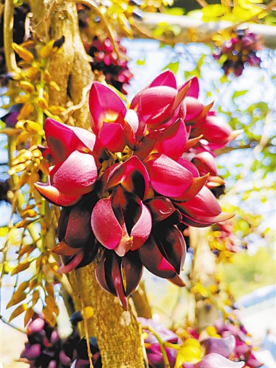 我終于登上山巔,來到那個罕見的常春油麻藤家族旁邊,眼前的景象,比我想象的更震撼。傷痕累累的蒼勁老藤猶如飛龍騰空而起,盤旋而上。只是,眼前的飛龍,是一條掛滿鮮花的飛龍。成千上萬的花朵,密密麻麻包裹著幾根老藤,每一朵,都像是紫色的飛鳥。這些花不是同時(shí)開放的:最早的已經(jīng)掉在地上,就像一群小鳥落地休息;更晚的還沒有吐出花蕊,像是巢中幼鳥,還在閉眼做夢;數(shù)量最多的,正迎風(fēng)怒放,雖然是陰天,但透進(jìn)樹林的弱光,讓它們格外明亮。