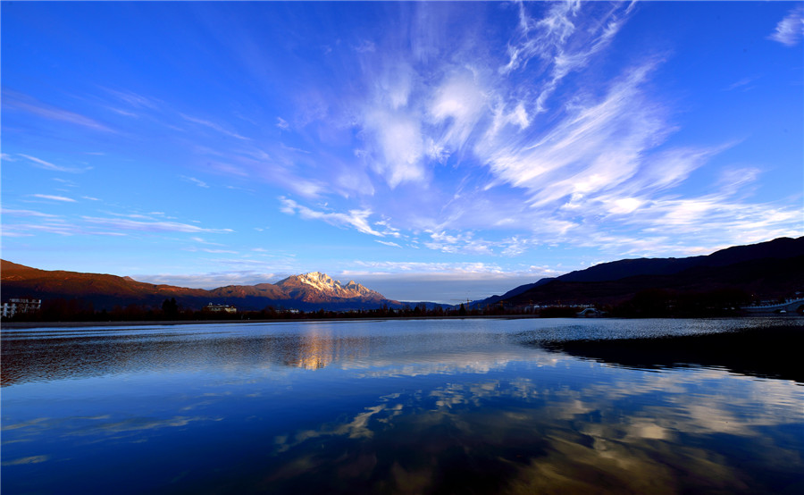 我是被亮光驚醒的。我和很多水從象山腳下的黑龍?zhí)睹俺鰜?lái)。咕咚一聲翻上水面??匆姾芏嗖煌拥娜?。黑頭發(fā)的人,黃頭發(fā)的人。黑眼睛的人,藍(lán)眼睛的人。我看見了潭邊的亭臺(tái)樓閣??匆娏嘶ㄅc樹。我還順著人們遠(yuǎn)眺的目光看見了玉龍雪山,晶瑩奪目矗立在藍(lán)天下面。潭水映照雪山,真讓人目眩神迷啊。人們?cè)跇蛏?,在堤上,說(shuō)著不同的語(yǔ)言。在不同的語(yǔ)言里,都有那個(gè)詞頻頻出現(xiàn):麗江,麗江。這時(shí)的麗江已經(jīng)是一座很大的城了。城里也不是只有最初筑城的納西人了。如今全中國(guó)全世界的人都要來(lái)麗江,看納西古城的四方街,看玉龍雪山。