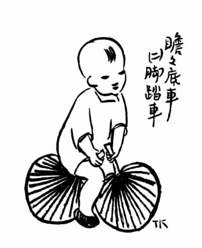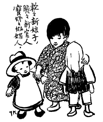 子愷先生藝術(shù)之獨特在另一方面——獨樹高標,表現(xiàn)童心童趣,抒情融入詼諧,展示了一種美學境界。此類經(jīng)典之作大多收集于《兒童相》。令人過目不忘者如畫孩子持兩蒲扇,一前一后,作騎馬狀,題曰“瞻瞻的腳踏車”;孩子將自己的鞋子墊于四腳圓凳之下,題曰“阿寶兩只腳,凳子四只腳”。于兒童經(jīng)驗之局限寫其心靈之天真,于不起眼的、平常人視之無所謂的現(xiàn)象中發(fā)現(xiàn)童心之美。還有一幅令人印象深刻,三個孩子,一女稍高,立于中,左側(cè)男孩,戴英式禮帽,甚大,右側(cè)女孩,頭蒙面布,題曰“軟軟新娘子,瞻瞻新官人,寶姊姊做媒人”。其事極不現(xiàn)實而孩子極慎重,于兒童顯示童心童趣,于畫則表現(xiàn)了先生的愛心和幽默。
