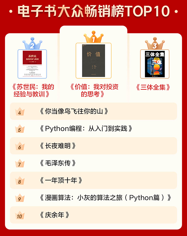 通過(guò)電子書(shū)暢銷榜TOP10和有聲暢銷榜TOP10可以看出,很多人愈發(fā)關(guān)注投資和管理等方面的內(nèi)容,也愈發(fā)注重個(gè)人學(xué)習(xí)?!秲r(jià)值:我對(duì)投資的思考》《蘇世民:我的經(jīng)驗(yàn)與教訓(xùn)》 分別位居電子書(shū)暢銷榜第一名和第二名?!吨袊?guó)經(jīng)濟(jì)2020》《原則》進(jìn)入有聲暢銷榜前十。此外,學(xué)習(xí)類圖書(shū)《Python編程:從入門到實(shí)踐》《漫畫(huà)算法:小灰的算法之旅(Python篇)》也上榜電子書(shū)暢銷榜前十。