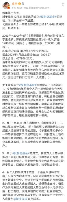 2021年1月19日,莊羽公布了“反剽竊基金”的最新進展:《圈里圈外》一書的全部收益已經(jīng)于1月4日核算完成。