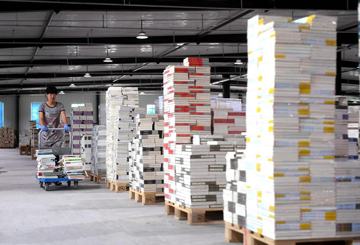 7月2日,在永清縣三圣口鄉(xiāng)一家圖書文化企業(yè)倉儲(chǔ)中心,工作人員在整理圖書。