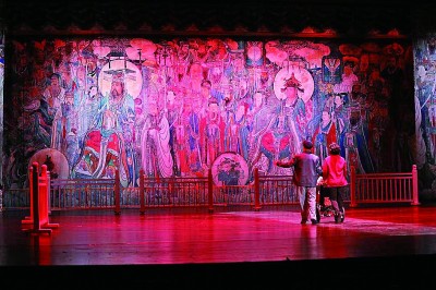 《永樂宮紀(jì)事》創(chuàng)造性地將蒲劇、歌劇、舞劇、話劇、音樂劇等多種藝術(shù)形式有機(jī)結(jié)合、融為一體,在充分利用地域文化元素的同時(shí),還將珍貴的永樂宮壁畫與現(xiàn)代聲光電等舞臺技術(shù)有機(jī)結(jié)合,營造出絢麗多彩的舞臺效果。