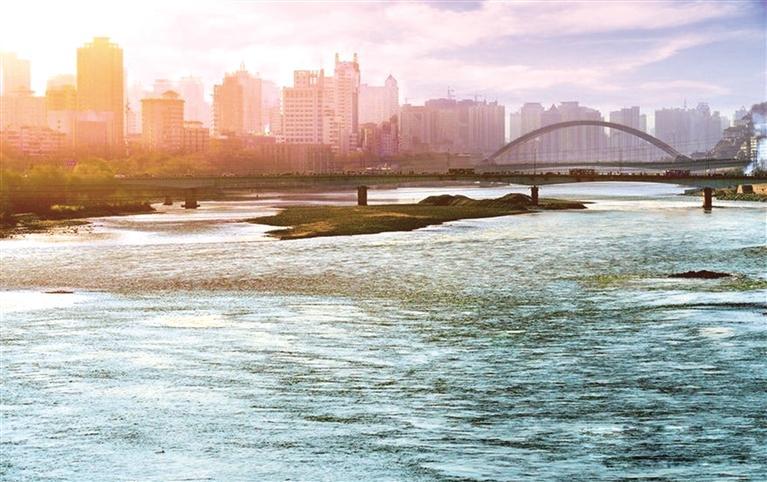 河分南北,勢接?xùn)|西。舒寧陜之博帶廣袖,帶青藏之峨冠雪衣。山逶迤而續(xù)祁連,水澎湃而瀉右?guī)?。匯洮湟之迤邐,有容乃大;與華夏之康莊,唇齒相依??睾游髯呃?,自古而始;俯渭涇秦川,由朝至夕。綴葫蘆狀岸渚坪灘,幾多古渡;依膏腴處坡谷盆地,即就蕃息。筑虹蜺經(jīng)百年,鐵橋第一;盤游龍於今朝,立交數(shù)十。去病鞭地,五泉山勝于秀逸;永誠建院,白塔寺高于云齊。指點九州,大禹登九州之臺;漂流黃河,洋人恐招手之磯。草覆馬銜而能牧,林茂興隆云可棲。繞營盤高嶺排五,峙雄關(guān)沿河有七。留千古名,白馬浪細(xì)聽湍流不息;鎖萬代鑰,金城關(guān)只留站牌不奇。雷壇留碑,金天觀曾殿宇壯麗;華林無寺,節(jié)能燈照幽路石基。湍流黃河,九曲回腸依然東去;水轉(zhuǎn)輪盤,十方高地亦滿紛披。