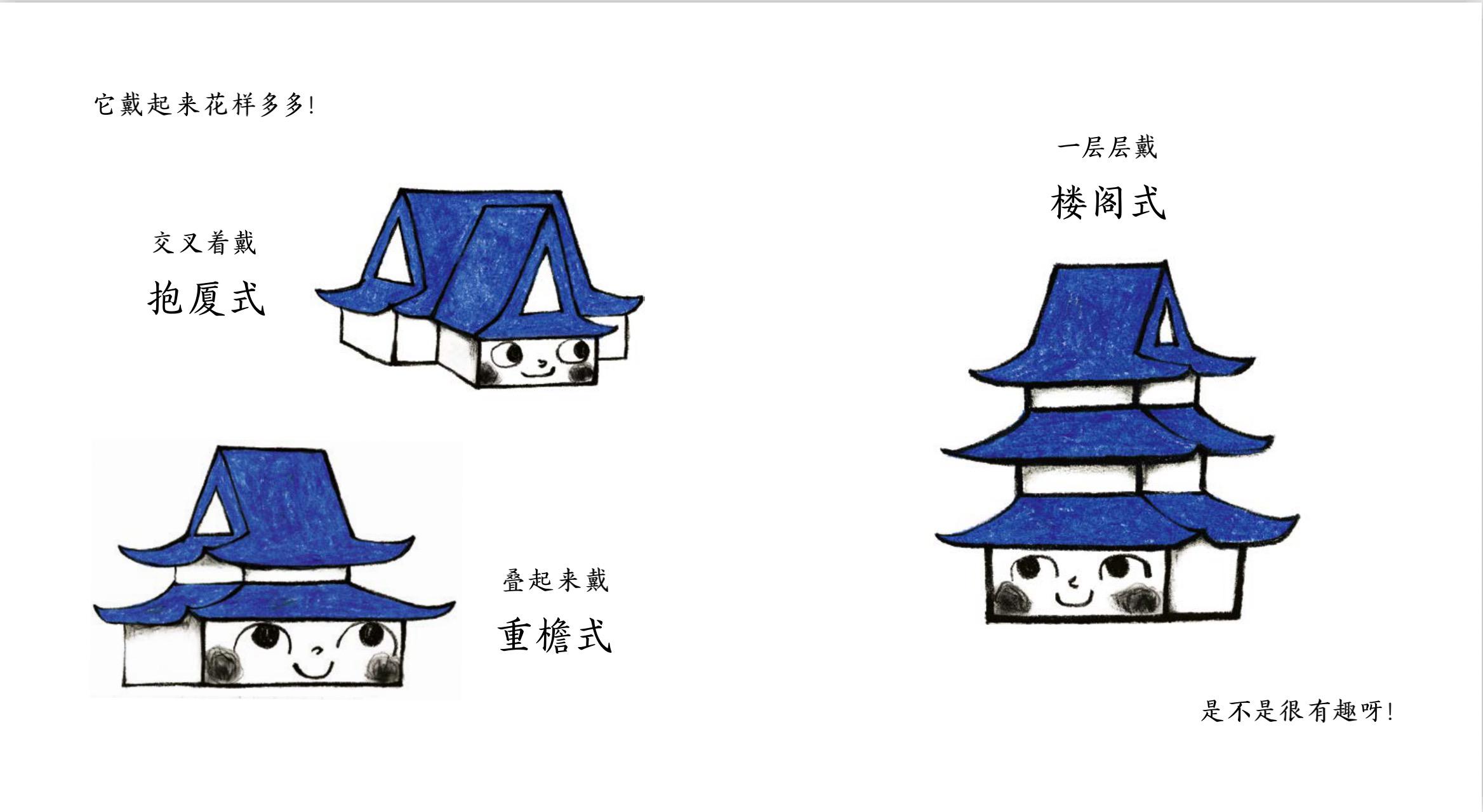 作者以真實(shí)的傳統(tǒng)建筑為原型,選取屋頂、鴟吻、窗欞、斗拱、瓦當(dāng)和柱礎(chǔ)這六個(gè)頗有代表性的傳統(tǒng)建筑構(gòu)件,讓他們自由地演繹自己的故事。比如,介紹屋頂時(shí),想象成“給房子戴帽子”,不同的“帽子”有不同的名字,還有不同的戴法: