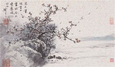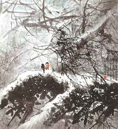 馮先生還和夫人在每年結(jié)婚紀(jì)念日時一起作畫,“我們?nèi)ツ赀^了綠寶石婚,結(jié)婚55周年。每到結(jié)婚紀(jì)念日,都是我們倆人畫一幅,畫一對小鳥。早在六七十年代最艱苦的時候就開始了,因為我夫人也是畫畫的,我們那時一起畫了一對小鳥在風(fēng)雪里,那幅畫我現(xiàn)在還有。后來我們一直畫鳥,風(fēng)景在不斷地變化,這和我們對生活的感受有很大的關(guān)系。”