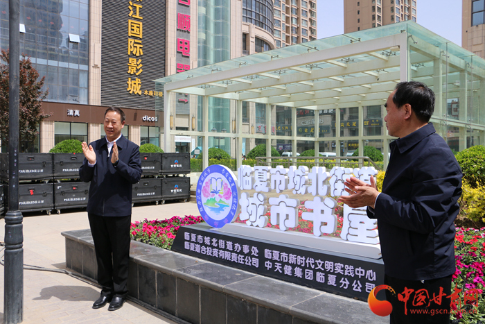 甘肅省委宣傳部副部長(zhǎng)、省新聞出版局(版權(quán)局)局長(zhǎng)王成勇(左)為臨夏市城北街道城市書(shū)屋揭牌