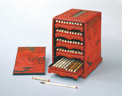 文房四寶與讀書人的關(guān)系十分密切。展廳里陳列的宮中文房用具非常精美,引得觀眾駐足細(xì)賞。一件飾有云山水岸圖案的紅漆筆匣,里面裝著50支毛筆,每支筆材質(zhì)、裝飾、筆頭造型各不相同,筆管上分別題有乾隆在不同時(shí)期所撰詠花詩。