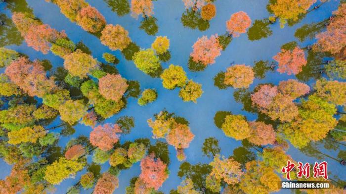 資料圖:初冬季節(jié),湖北武漢新洲區(qū)漲渡湖濕地?cái)?shù)千棵水杉葉紅似火、五彩斑斕,美景如畫(huà)。中新社發(fā) 趙廣亮 攝