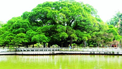 擁有古樹的城市就是擁有歷史的城市。福州古榕遍布,四季常青,是城市、市民生活與樹木的完美結合,是風景的自然生長,是歷史根深葉茂地屹立。福州古榕以樹齡長、歷史久、數(shù)量眾而著稱。見證福州城市史的,當首推鼓山國家森林公園、八一水庫旁,福州無人不知的已近千歲,被譽為福州榕樹王的古榕。相傳,這棵古榕是張伯玉所栽植的兩棵樹苖,光陰荏苒,同氣相求,如今兩棵榕樹相互糾結、勾連、纏繞、親密,已無分彼此。其冠幅達1300米,可容納千人在樹下談古論今,聊天遮陰。遠望,似綠色陵巖;近看,知其為榕也,密密的枝葉把近午的陽光切割成碎花點,散落、閃亮在榕樹下的草坪和地衣上。初訪者或為訝異:偌大一棵古榕卻不見氣根,知榕者會告訴你,這是一株碩大、古老而不生氣根的細葉榕。因其冠幅日益長大,為了支撐沉重的樹冠、預防主干折損,便制作了若干石柱,砥柱其間。古榕下有湖塘,錦鯉游泳,不時生出紅色漣漪。旁有一碑,上刻:榕蔭照水波心漾,觀魚猶勝花間行。