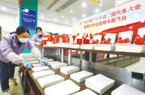 連日來,江蘇省連云港市東??h新華書店精心設(shè)置了黨的二十大重要文件出版物專題展臺,集中展示展銷黨的二十大文件及學(xué)習(xí)輔導(dǎo)讀物,同時(shí)增設(shè)閱讀區(qū),市民可以隨時(shí)閱讀黨的二十大報(bào)告單行本、《黨的二十大報(bào)告輔導(dǎo)讀本》、《中國共產(chǎn)黨章程》單行本等圖書,吸引了眾多黨員、學(xué)生、市民和機(jī)關(guān)企事業(yè)單位人員等不同群體的讀者前來閱讀選購。