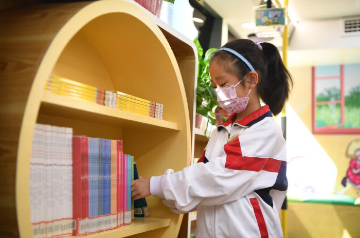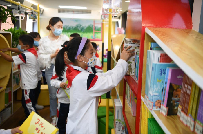 11月10日,學(xué)生在長沙市青園友誼小學(xué)巴士圖書館內(nèi)歸還圖書。