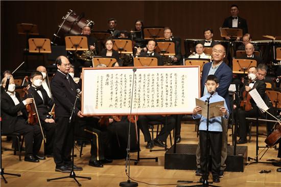 2月23日,北京,“前哲垂范 文津日新”——梁?jiǎn)⒊Q辰150周年紀(jì)念配樂(lè)朗誦音樂(lè)沙龍?jiān)趪?guó)家圖書館舉行。中國(guó)國(guó)家圖書館館長(zhǎng)熊遠(yuǎn)明(左)向梁?jiǎn)⒊笕速?zèng)手書《少年中國(guó)說(shuō)》。 蔣啟明/攝