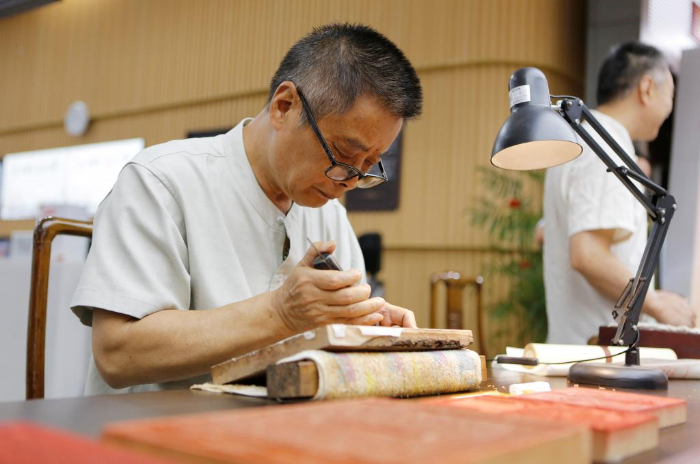 8月22日,在揚州市圖書館,江蘇省雕版工藝美術(shù)大師沈樹華在“古籍里的揚州運河文化”市集上為市民展示雕刻技藝。