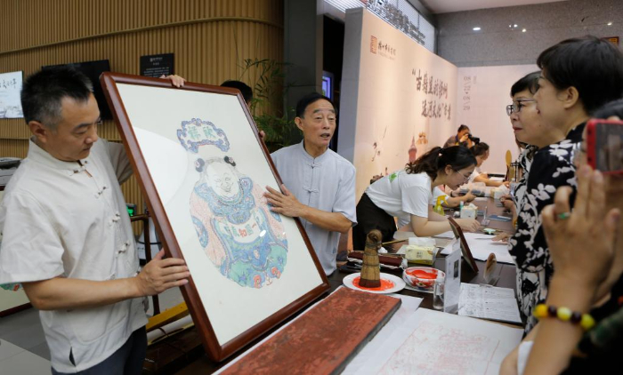 8月22日,在揚州市圖書館,雕版印刷技藝代表性傳承人李江民在“古籍里的揚州運河文化”市集上為市民展示雕版印刷品。