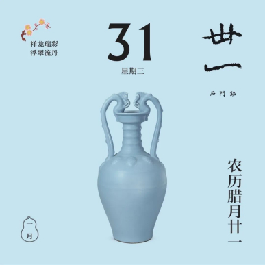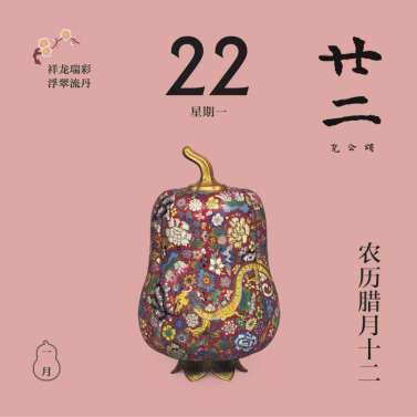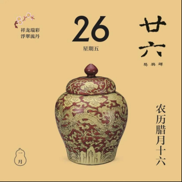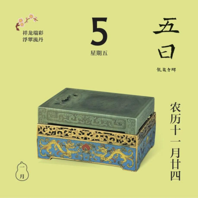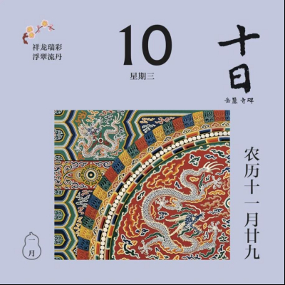 翻開(kāi)1月月份頁(yè),首先跳入眼簾的,是主題詞“祥龍瑞彩”。這個(gè)月以絢麗的顏色為主線,串起各色龍文物,比如精致的宋代單色釉龍紋盤(pán),絢麗的故宮官式建筑和璽彩畫(huà),還有優(yōu)雅的清代掐絲琺瑯游龍花卉紋瓜式蓋罐……
