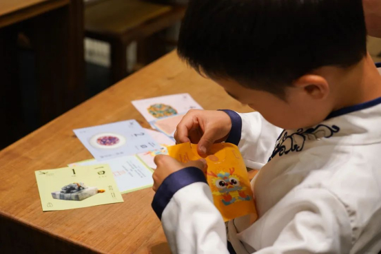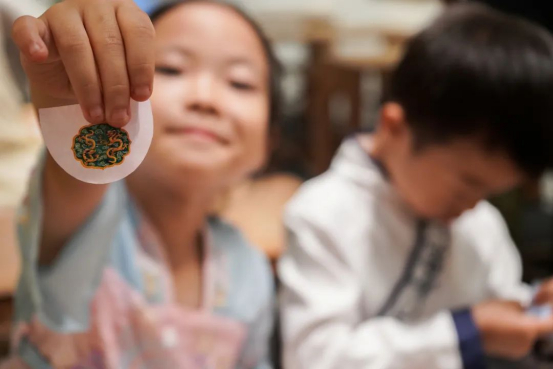 每個(gè)龍文物故事上方,也印有當(dāng)天文物的小圖,它周?chē)橛幸蝗Π雸A打孔的攏線。如意用小手沿著攏線輕輕一摳,一片小小的“龍鱗”就落在了手心。原來(lái),它就是今天的“成長(zhǎng)值”啊。