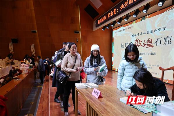 11月10日晚、11月11日下午,作為第二屆岳麓書會系列活動之一,由湖南文藝出版社舉辦的《“畫”中有話:敦煌石窟百講》新書分享會系列活動分別在長沙樂之書店一中店和長沙圖書館舉行。該書策劃人之一、敦煌研究院文化弘揚部副部長宋淑霞攜新書現(xiàn)身長沙,和讀者分享燦爛的敦煌石窟藝術(shù)。雖然天氣嚴寒,讀者熱情絲毫不減,兩場活動均獲得熱烈反響。