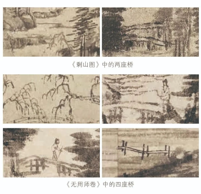 《富春山居圖》全卷共畫有六座橋,其中《剩山圖》上有兩座橋,《無(wú)用師卷》上有四座橋。讓我們先找到其中的一座橋,它在梁詩(shī)正書寫的“鑒定”開(kāi)頭部分正下方。你有沒(méi)有發(fā)覺(jué),這座橋最為特殊。